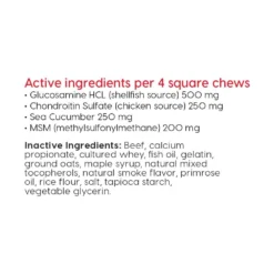 Active ingredients per 4 soft chew squares: Glucosamine HCL (shellfish source) 500 mg, Chondroitin Sulfate (chicken source) 250 mg, Sea Cucumber (farm raised) 250 mg, MSM (methylsulfonylmethane) 200 mg.