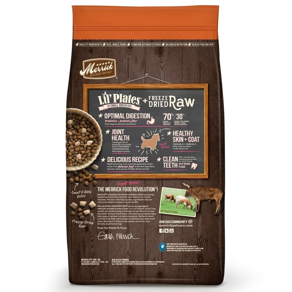 Merrick Grain Free Lil’ Plates + Freeze Dried Raw Dry Dog Food recipes deliver a perfect combination of protein-rich, grain-free kibble plus real, whole pieces of freeze-dried raw meat for enhanced nutritional benefits and fresh taste of a raw diet in a convenient format for pet parents. Recipes are made in the USA.