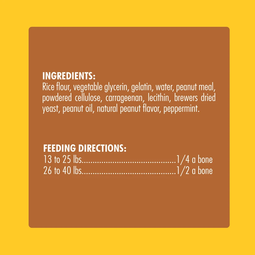 Rice flour, vegetable glycerin, gelatin, water, peanut meal, powdered cellulose, carrageenan (natural seaweed extract), lecithin, brewers dried yeast, peanut oil, natural peanut flavor, peppermint.