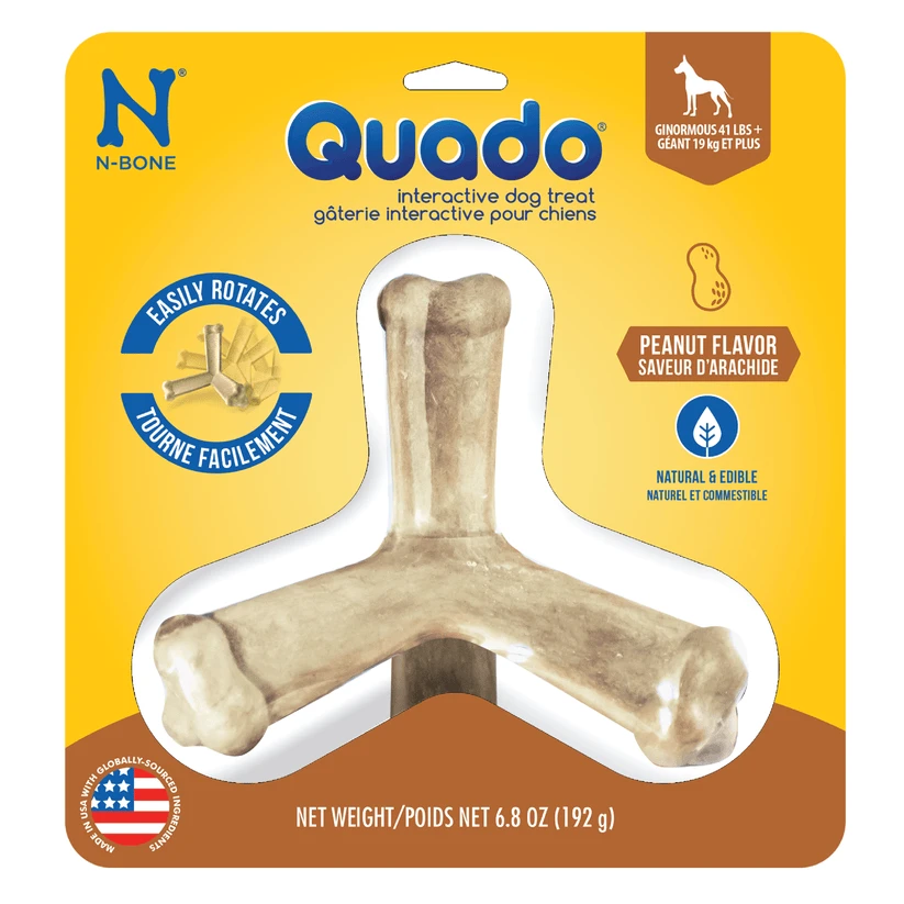 Does your dog love to chew, but can’t get a grip on small bones and chews? N-Bone® Quado® is the solution your dog has been searching for! N-Bone® Quado® is the bone that stands on its own! The unique “quad” design makes it easy for your canine pal to hold, chew, and play. Quado® is easy for dogs to move into whatever chewing position they want! Quado® also helps remove plaque and tartar as your dog chews, while delicious peanut flavor entices and peppermint helps freshen breath. Its great for oral health! Quado® is not made with any plastic, nylon or rubber and is completely edible. Keep your dog entertained and help curb destructive chewing behaviors with this unique interactive treat!