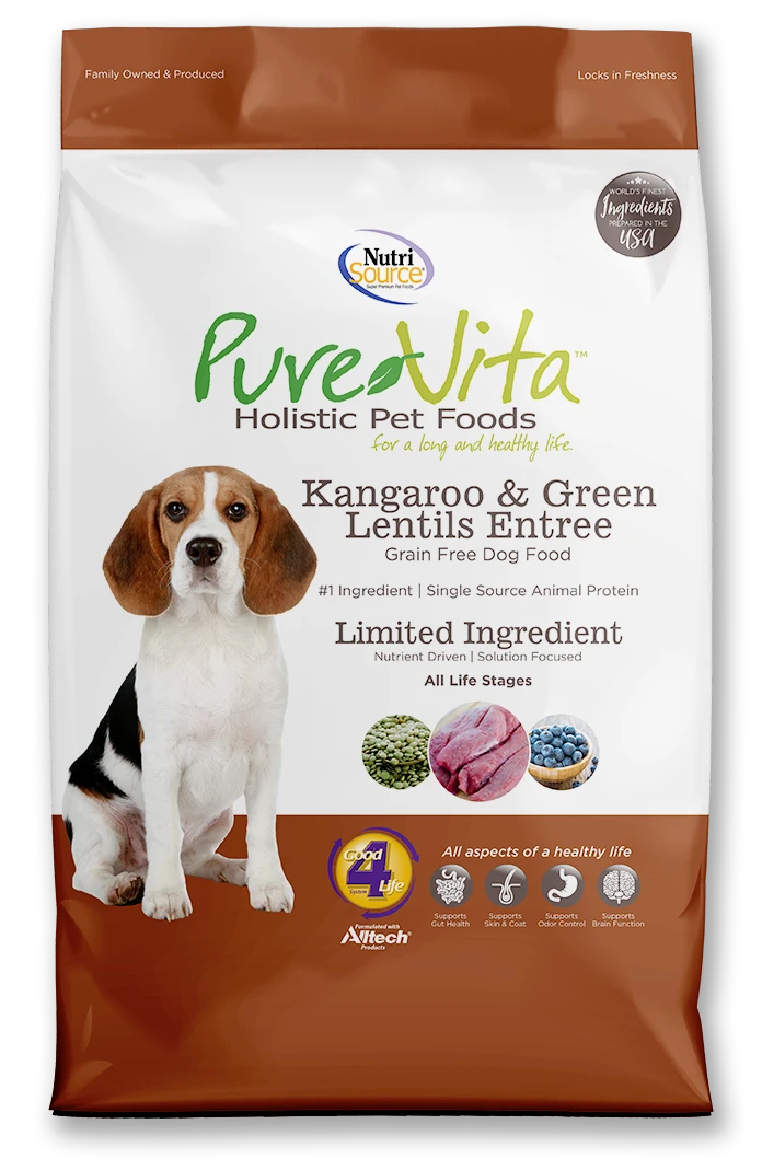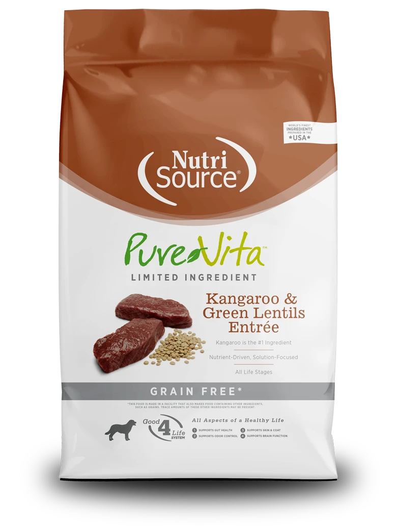- As a member of our grain free series of dog foods, NutriSource Pure Vita Kangaroo & Green Lentils Entrée Dog Food is formulated to meet AAFCO guidelines for all life stages.