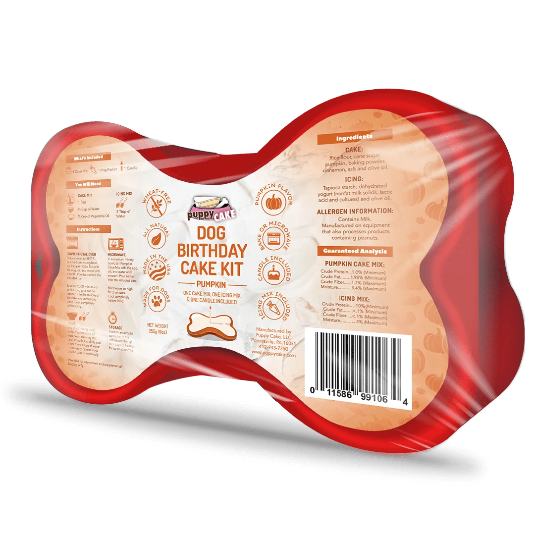 We know humans love Pumpkin Spice lattes and now your pooch can enjoy their own decadent treat inspired by this popular flavor! Our cake mixes result in a light, fluffy and moist cake for your dog to enjoy. We believe that our furry friends should be celebrated in style, which is why we wanted to create healthy birthday cakes you can make at home. These dog birthday cakes come complete with icing so you can have a dog bakery at home! Fed in moderation, Puppy Cake is a fun and healthy supplement to your dog’s diet.
