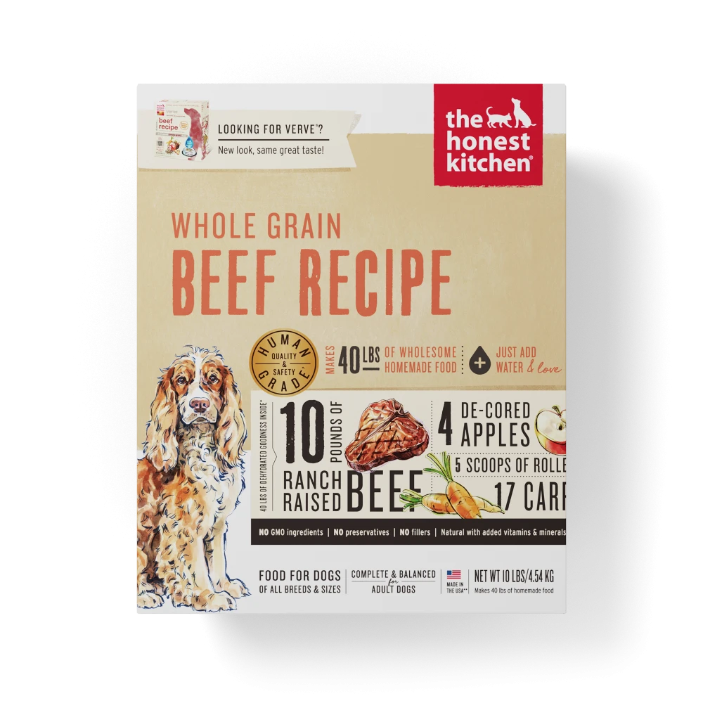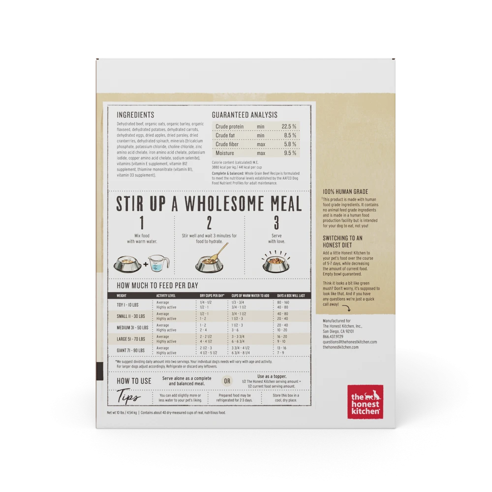 Before there was The Honest Kitchen, there was this single recipe, made by our company founder—Lucy, in her own (honest) kitchen. This meat-and-potatoes dish is greater than the sum of its parts, and it had to be since it’s the one that started it all. It’s claim to fame is that it was the world’s FIRST human grade pet food. See what all the fuss is about with tasty ranch-raised beef, fresh produce, and whole grain goodness. This complete and balanced dish nourishes adult and senior dogs looking to maintain their doggy figures. It’s low calorie, low protein, low fat, but high in yumminess.