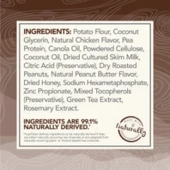 Potato Flour, Coconut Glycerin, Natural Chicken Flavor, Pea Protein, Canola Oil, Powdered Cellulose, Coconut Oil, Dried Cultured Skim Milk, Citric Acid (Preservative), Dry Roasted Peanuts, Natural Peanut Butter Flavor, Dried Honey, Sodium Hexametaphosphate, Zinc Propionate, Mixed Tocopherols (Preservative), Green Tea Extract, Rosemary Extract