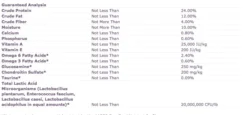Vitamins: Choline Chloride, Beta-Carotene, Vitamin E Supplement, Ascorbic Acid, Vitamin A Supplement, Niacin, Calcium Pantothenate, Riboflavin, Vitamin D-3 Supplement, Pyrodoxine Hydrochloride, Thiamine Mononitrate, Folic Acid, Biotin, Vitamin K Supplement, Vitamin B-12 Supplement, Chicory Root Extract, Glucosamine-HCl, Chondroitin Sulfate, Garlic, Taurine, Yucca Schidigera Extract, Green Tea Extract, Lactobacillus plantarum, Enterococcus faecium, Lactobacillus casei, Lactobacillus acidophilus. Old Mother Hubbard uses ethoxyquin-free meat sources.
