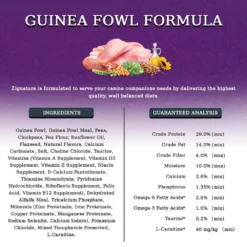 Guinea Fowl, Guinea Fowl Meal, Peas, Chickpeas, Pea Flour, Sunflower Oil, Flaxseed, Natural Flavors, Calcium Carbonate, Salt, Choline Chloride, Vitamins (Vitamin A Supplement, Vitamin D3 Supplement, Vitamin E Supplement, Niacin Supplement, d-Calcium Pantothenate, Thiamine Mononitrate, Pyridoxine Hydrochloride, Riboflavin Supplement, Folic Acid, Vitamin B12 Supplement), Dehydrated Alfalfa Meal, Tricalcium Phosphate, Minerals (Zinc Proteinate, Iron Proteinate, Copper Proteinate, Manganese Proteinate, Sodium Selenite, Calcium Iodate), Potassium Chloride, Carrots, Blueberries, Cranberries, Preserved with Mixed Tocopherols.