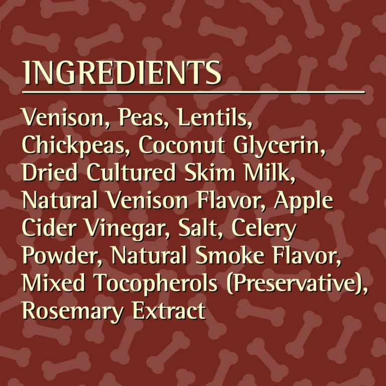 VENISON, PEAS, LENTILS, CHICKPEAS, COCONUT GLYCERIN, DRIED CULTURED SKIM MILK, NATURAL VENISON FLAVOR, APPLE CIDER VINEGAR, SALT, CELERY POWDER, NATURAL SMOKE FLAVOR, MIXED TOCOPHEROLS (PRESERVATIVE), ROSEMARY EXTRACT.